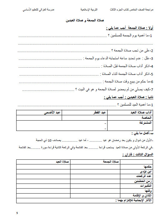حل درس صلاة الجمعة والعيدين تربية إسلامية صف خامس فصل ثالث مدرستي الامارتية